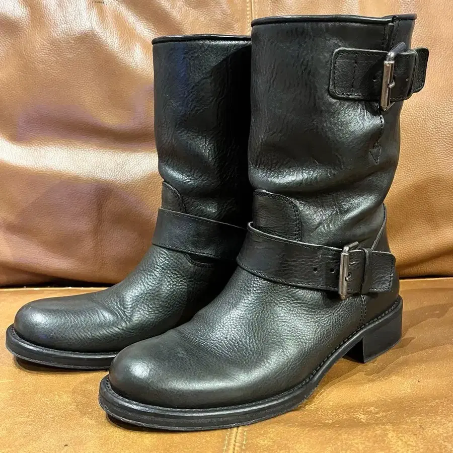 이탈리아제 파비오 루스코니 엔지니어 부츠 더블 버클 천연 가죽 주름 가죽 블랙