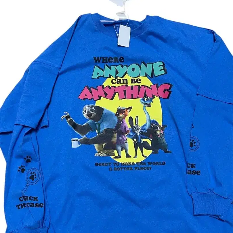 애니메이션 캐릭터가 프린트된 파란색 긴팔 티셔츠.