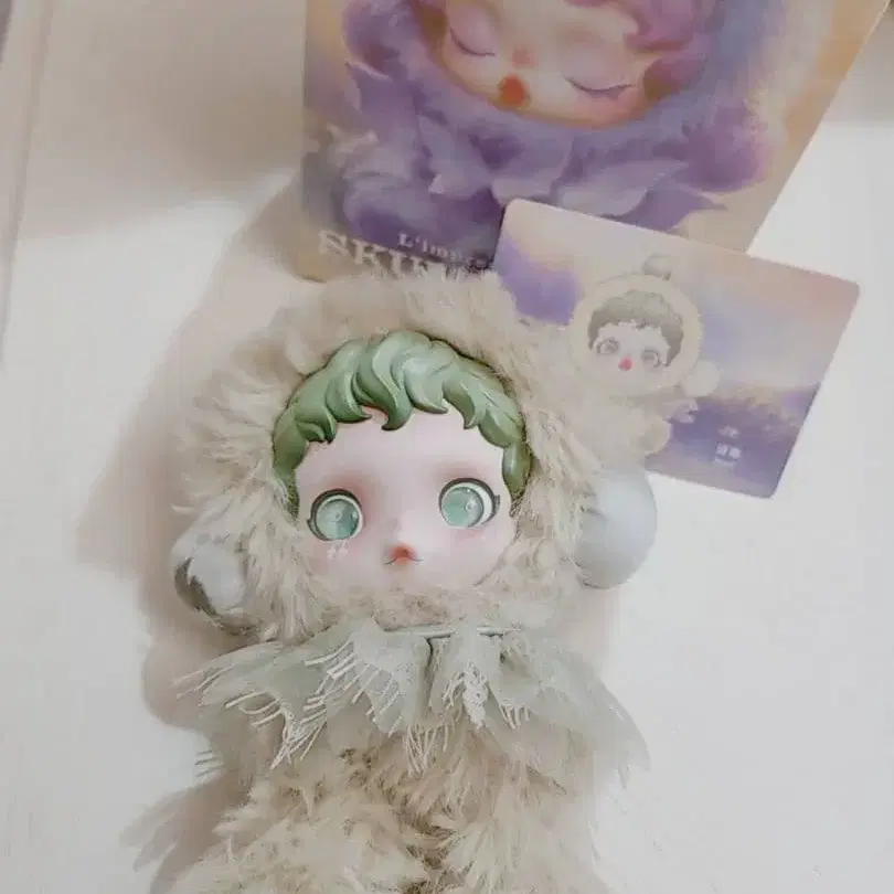 후드 부착 스켈레톤 인형, 크림색 퍼와 그린색 머리카락이 특징입니다. ※ 개봉 완료 - 모델명: 스켈레톤 인형 - 색상: 크림색과 그린색 - 소재: 퍼와 플라스틱 - 특징: 후드 부착, 큰 눈 - 장식: 레이스 리본 방문해 주셔서 감사합니다.