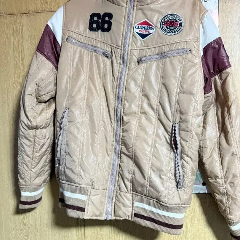 퀼팅 디자인의 베이지 자켓, 66 번호와 캘리포니아 로고 부착. - 색상: 베이지 - 디자인: 퀼팅 - 특징: 지퍼 포켓 부착 - 번호: 66 - 로고: 캘리포니아 - 소재: 나일론 방문해 주셔서 감사합니다.