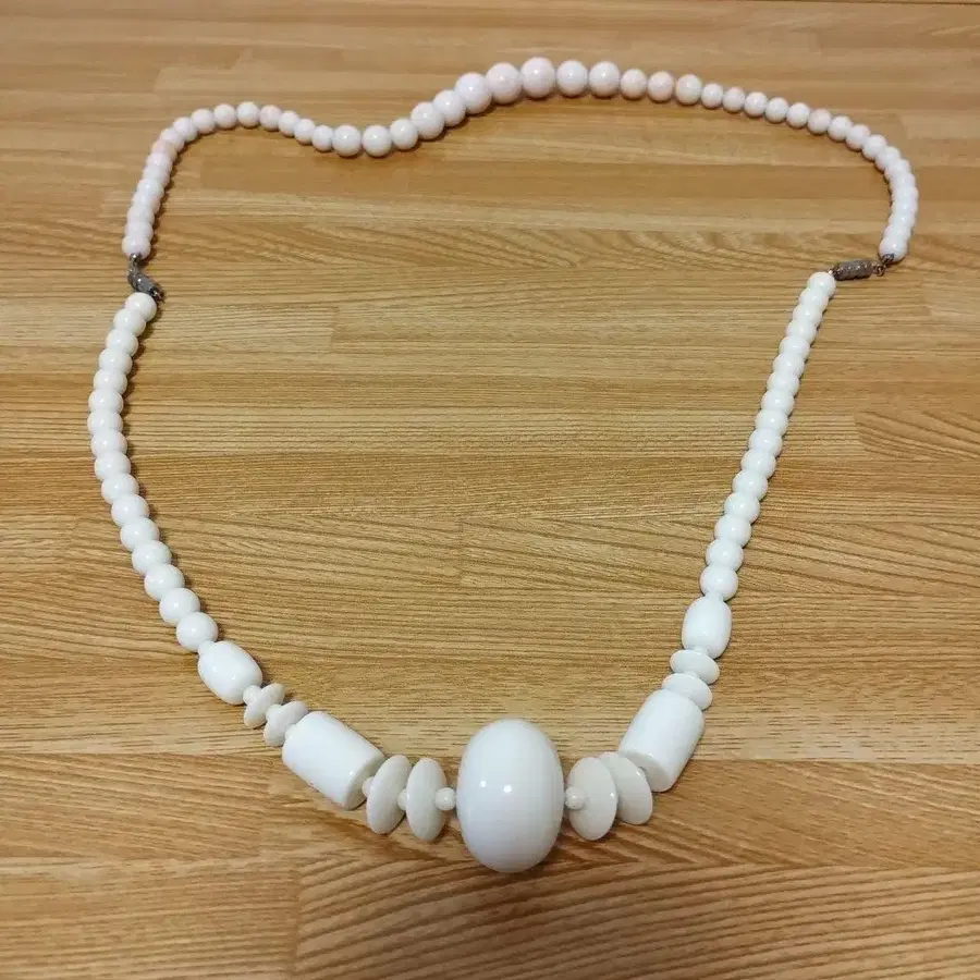 다양한 모양의 비즈가 특징인 화이트 목걸이. - 색상: 화이트 - 디자인: 비즈 목걸이 - 소재: 플라스틱 - 특징: 다양한 모양의 비즈가 조합된 디자인 방문해 주셔서 감사합니다.