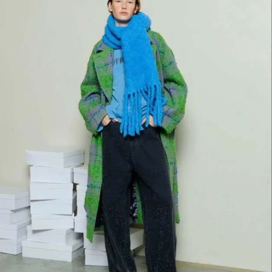 그린과 블루 체크가 특징인 더블 브레스트 롱 코트.
