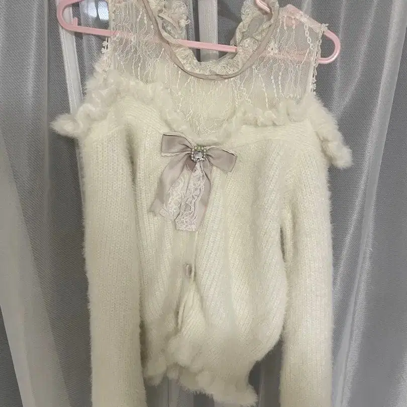 LIZLISA 레이어드 스타일 어깨 트임 니트 ♡ LIZLISA ♡ freesize ♡ white x pink 3회 정도 착용했습니다. 눈에 띄는 얼룩은 없습니다. 리본 포함. 즉시 구매 OK