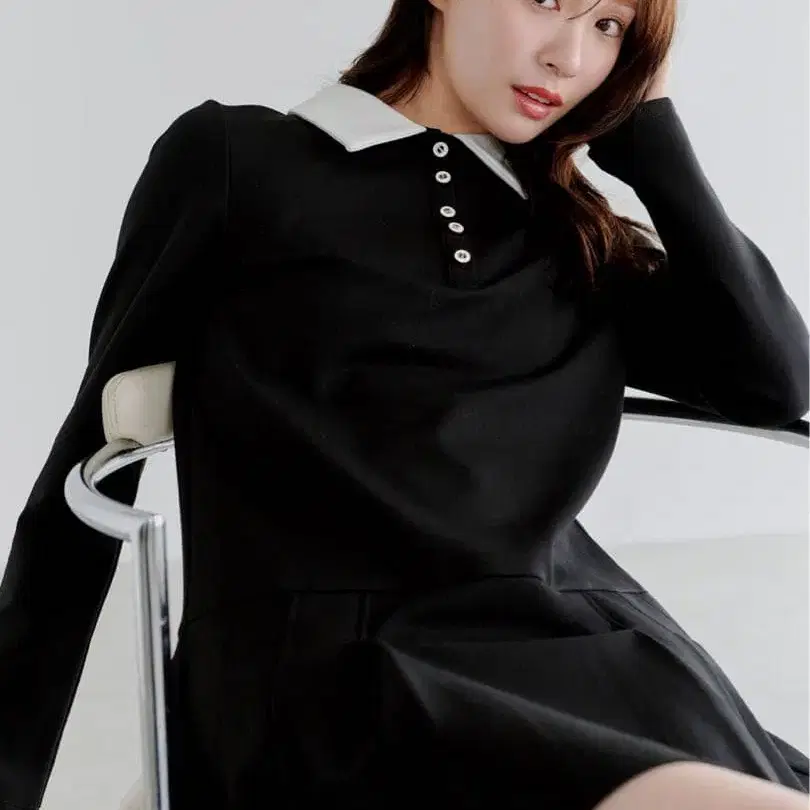 옷깃이 화이트로 배색 마감된 클래시컬한 블랙. 가을/겨울에 어울리는 스트레치성이 있는 두꺼운 티셔츠 원단을 사용했습니다. 서스테인 소재입니다. 안감은 없습니다. 플리츠는 한쪽으로 접은 플리츠로 마무리했습니다.