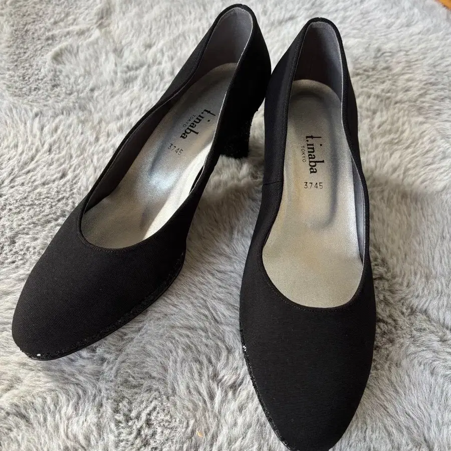 블랙 스웨이드풍 소재에 글리터 힐 디자인이 특징인 펌프스.