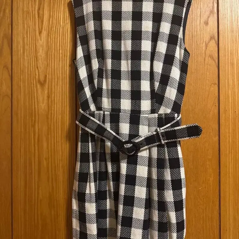 블랙과 화이트 체크 무늬로, 허리 벨트가 달린 슬리브리스 무릎 기장 원피스.