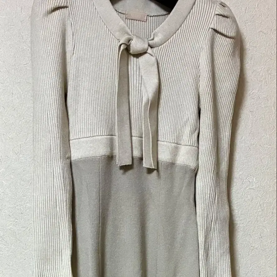 리본이 포함된 아이보리 니트 원피스, 긴팔에 플레어 스커트 디자인입니다. 얼룩이 있습니다. - 색상: 아이보리 - 디자인: 리본 포함, 긴팔 - 스타일: 플레어 스커트 - 소재: 니트 방문해 주셔서 감사합니다. 사이즈 - FREE SIZE