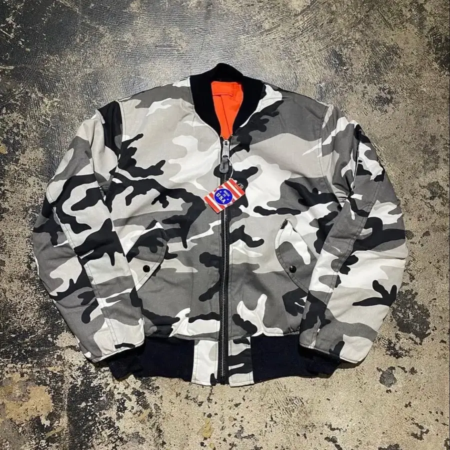 미국제 카모플라쥬 MA-1 플라이트 자켓입니다. 구제 의류점에서 데드스탁으로 구매 후 몇 번 착용했습니다. 택은 없습니다.