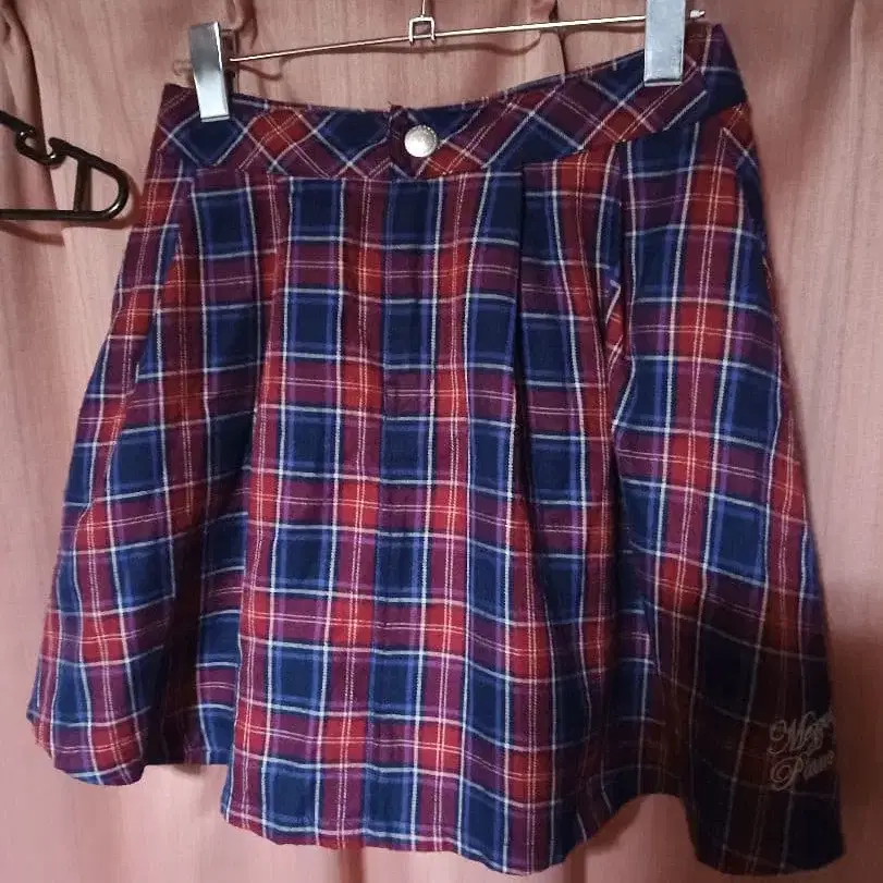 빨간색과 파랑색 체크 무늬 플리츠 스커트, Mezzo Piano 자수 포함.