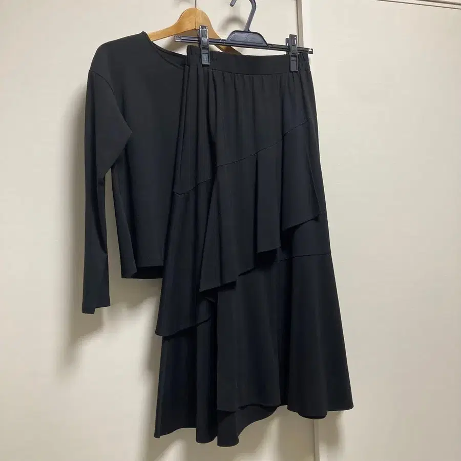 블랙 플레어 스커트와 상의 세트, 레이어드 디자인으로 스타일리시합니다.