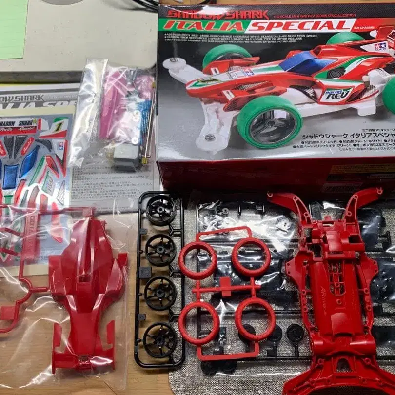 미니 사륜구동 한정판 키트인 쉐도우 샤크 이탈리아 스페셜 키트의 섀시 A 부품, 타이어, 휠을 빨강과 검정으로 통일한 자체 편집 키트입니다. 섀시는 구형 폴리카 강화 타입입니다.