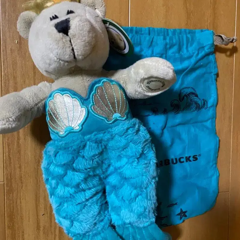 스타벅스 머메이드 디자인 봉제 인형, 파란색에 왕관 포함. 머메이드 베어리스타 햇볕이 들지 않는 방에 장식으로 보관했습니다.