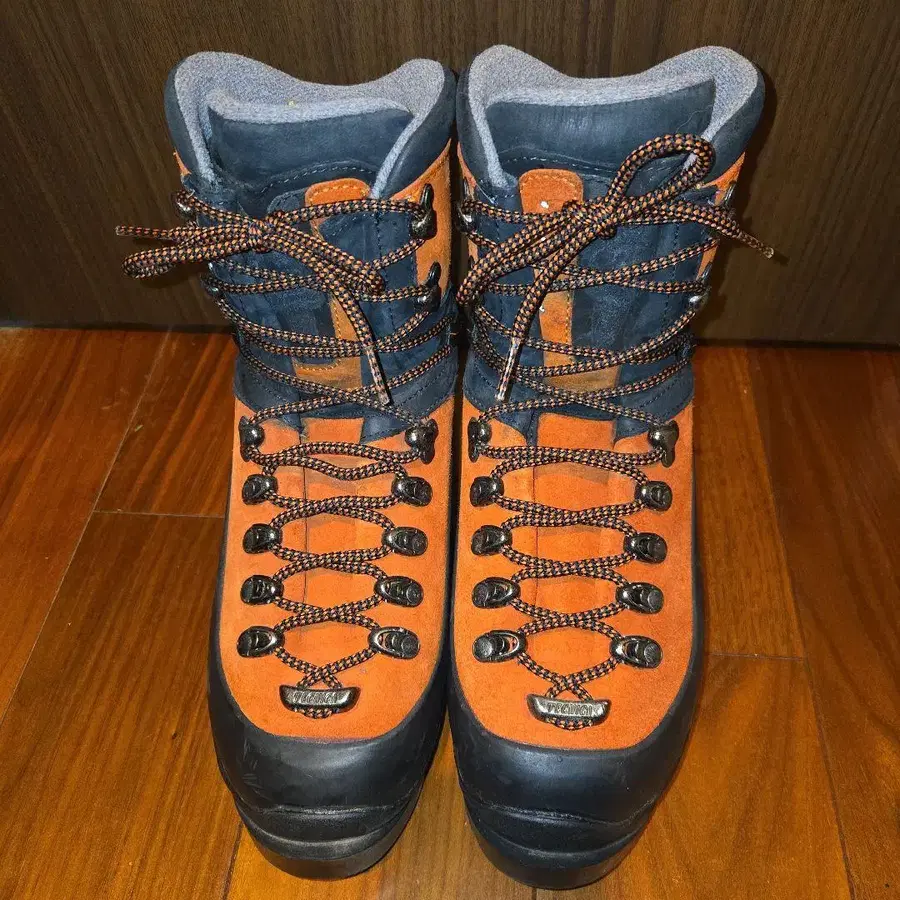 자동 번역되었어요. 원문보기가죽 겨울 등산화, 오렌지와 블랙 배색.