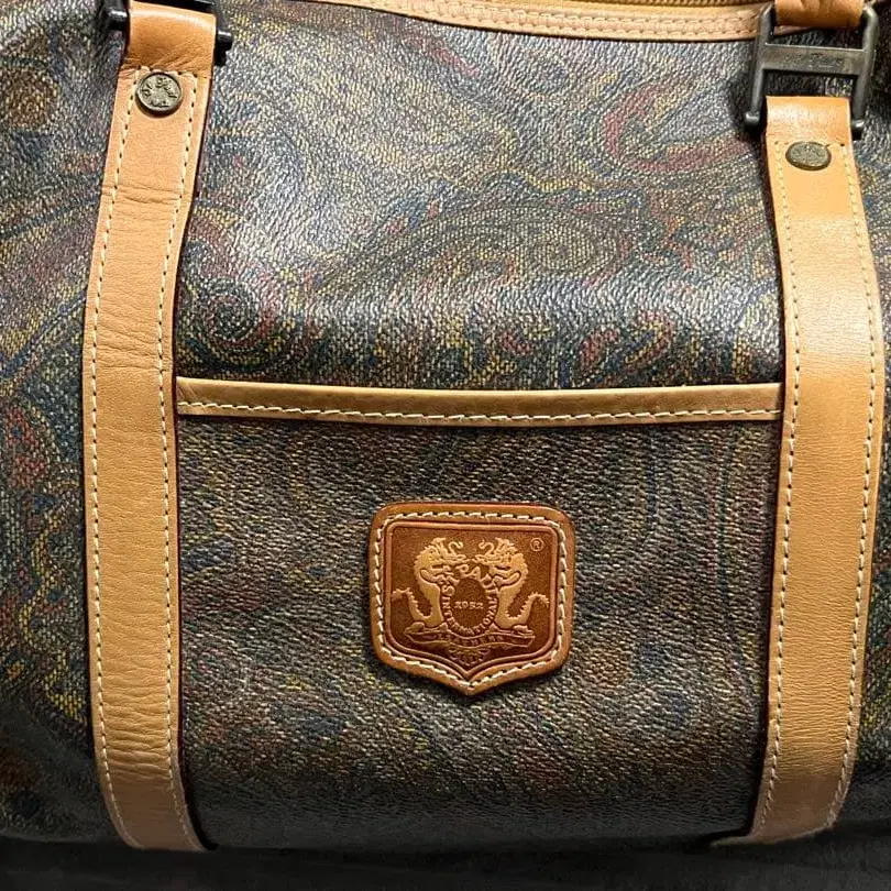 페이즐리 무늬 합성 피혁 보스턴 백, 더블 지퍼 개폐.