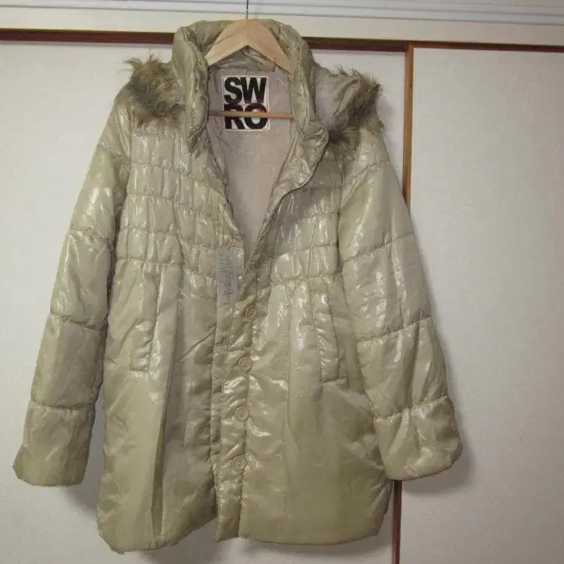 광택감이 있는 베이지색 롱 다운 자켓, 퍼 부착 후드가 특징입니다.