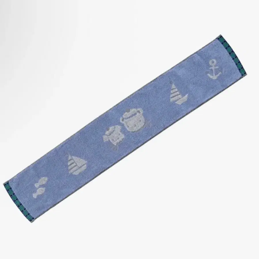 일반 페이스 타월보다 가늘어 목에 걸거나 감아서 활용하기 좋은 머플러 타월입니다. 흰색 실 부분은 폴리에틸렌 소재로 보송보송한 촉감이 포인트입니다.