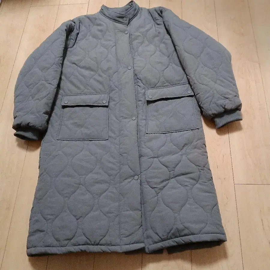 퀼팅 디자인의 그레이 롱 코트입니다. 스탠드 카라와 리브가 있는 소매로 방한성이 뛰어납니다. M 사이즈이지만 상당히 넉넉합니다.