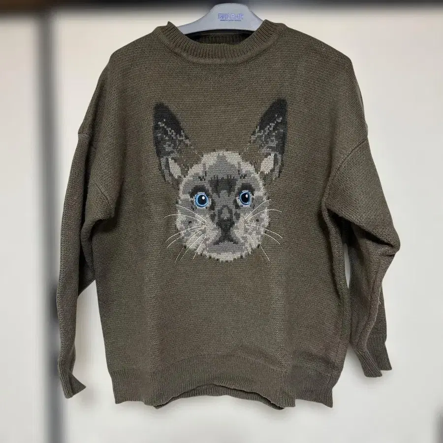 올리브 그린 색상의 고양이 얼굴이 특징인 스웨터. - 색상: 올리브 그린 - 디자인: 고양이 얼굴 뜨개질 - 브랜드: mnmts - 특징: 파란 눈을 가진 고양이 디자인 방문해 주셔서 감사합니다. 사이즈 - L