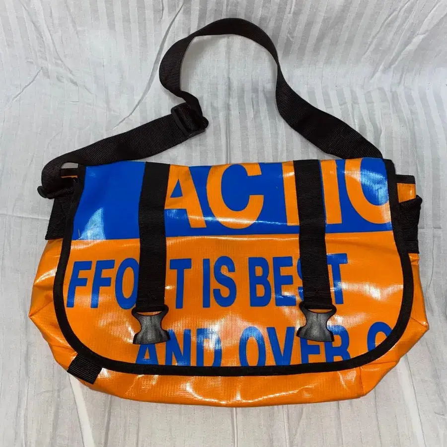 [ 상품 상세 ] 비비드한 오렌지와 블루의 배색이 눈길을 끄는, 대용량 메신저 백입니다. 트럭 천막과 같은, 두꺼운 원단과 튼튼한 타폴린 소재 (방수, 방오성이 뛰어난 소재)로 만들어져 비 오는 날에도 내용물을 보호해 줍니다. [ FFORT IS BEST ] 등의 타이포그래피가 디자인되어 있어, 스트릿 패션이나 사이클링 스타일에 딱 맞는 유니크한 아이템입니다. [ 주요 특징 ] • 소재: 물과 얼룩에 강한 튼튼한 타폴린 원단. • 수납: 메인 수납 공간이 넓어 A4 사이즈나 노트도 여유롭게 들어가는 사이즈감입니다. 내부에 잡화를 분리하기 편리한 포켓이 있습니다. • 개폐: 더블 버클 사양으로, 짐의 양에 맞춰 조절 가능. • 벨트: 와이드한 숄더 스트랩으로, 무거운 짐도 어깨에 부담을 덜어줍니다. [ 상태 ] 눈에 띄는 큰 흠집이나 찢김은 없지만, 소재 특성상 표면에 특유의 스크래치와 주름감이 있습니다 (리사이클 소재 특유의 질감입니다). 안쪽도 비교적 깨끗한 상태로, 앞으로도 오래 사용하실 수 있습니다. 자세한 내용은 이미지를 확인해 주세요. [ 사이즈 ] (※ 실측치수를 측정하여 기재하는 것을 추천합니다) • 가로 길이: 약 46cm • 높이: 약 32cm • 바닥: 약 15cm 발송에 대해: 접어서 포장하여, 익명 배송으로 발송 예정입니다. #메신저백 #뉴스페이퍼백 #타폴린 #방수백 #스트릿패션 #사이클링 #자전거백 #유니크