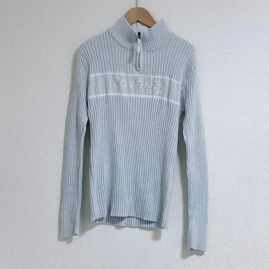 캘빈클라인 jeans 하프 지퍼 니트 구제 의류 가게에서 구매했습니다. 기장 약 60cm 가슴 너비 약 45cm 사이즈 M 색상 라이트 블루, 화이트 캘빈클라인 로고 리브 니트 상의