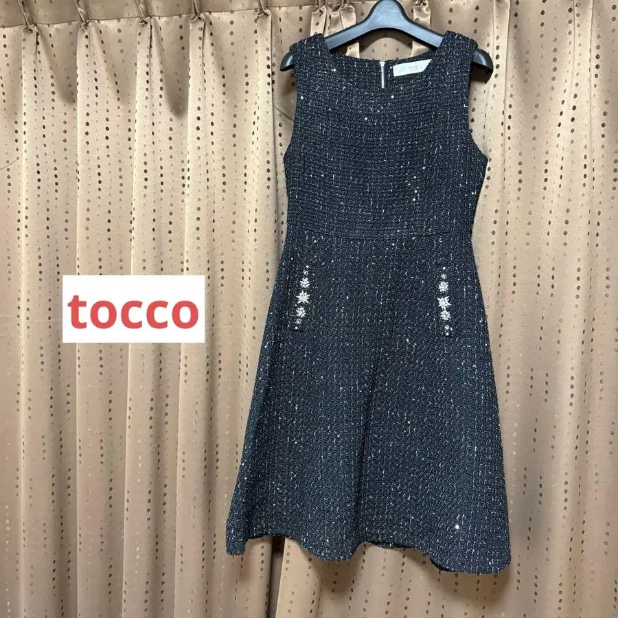 자동 번역되었어요. 원문보기tocco closet 슬리브리스 블랙 트위드 원단 A라인 원피스입니다.