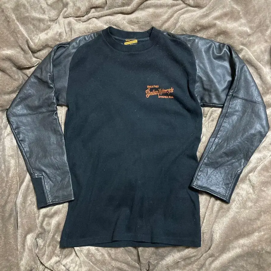 블랙 코튼 바디에 소가죽 레더 소매를 가진 인디언 모터사이클의 긴팔 셔츠.