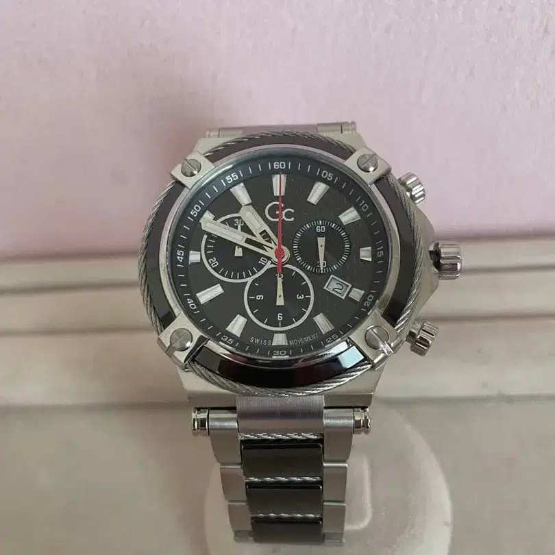 스테인리스 스틸 소재의 크로노그래프 손목시계, 블랙 다이얼. - 브랜드: GC ジーシー - 색상: 블랙 - 소재: 스테인리스 스틸 - 기능: 크로노그래프 - 밴드 타입: 링크식 - 케이스 사이즈 약 48mm - 팔 둘레 약 20cm - 배터리 교환 완료 - 부속물 없음 개인 측정으로 인한 오차는 양해 부탁드립니다. 예민하신 분의 구매는 삼가해 주십시오. 방문해 주셔서 감사합니다.
