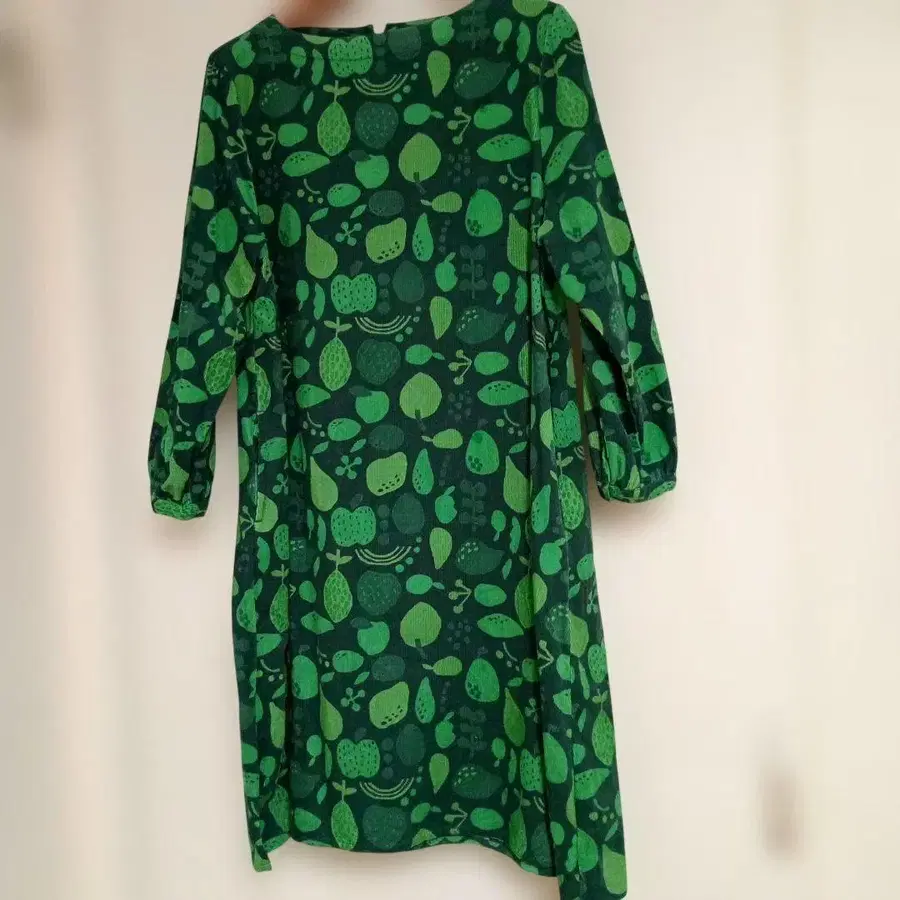 자동 번역되었어요. 원문보기후르츠와 잎사귀 패턴이 특징인 그린 컬러의 무릎 기장 원피스, 벌룬 슬리브와 라운드넥 디자인.