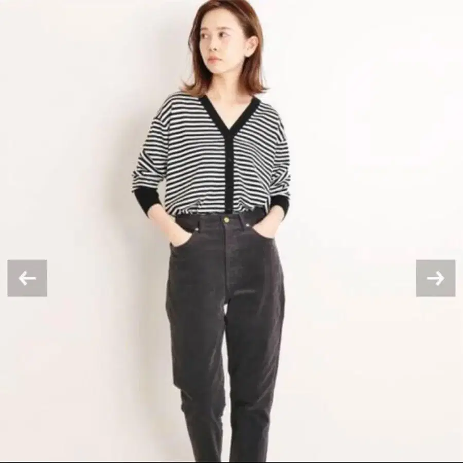 블랙과 화이트 스트라이프 디자인의 V넥 스웨터, 버튼이 있어 스타일리시합니다.