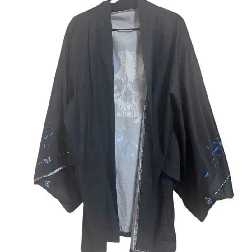 스컬과 나비 디자인이 특징인 블랙 겉옷. 1~2회 착용 - 색상: 블랙 - 디자인: 스컬과 나비 프린트 - 장식: 파란 꽃과 나비 자수 - 스타일: 오픈 프론트 겉옷 - 소재: 경량 원단 상의 기장: 75 어깨 너비: 56 가슴 너비: 59 소매 길이: 34 ※ 개인 측정으로 인한 오차가 있을 수 있습니다. 이해해 주시는 분께 부탁드립니다. 방문해 주셔서 감사합니다. 사-10