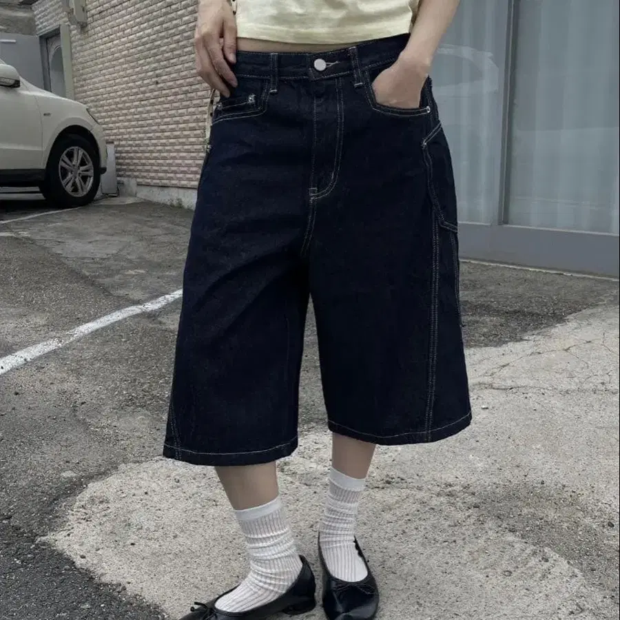 UNE MANSION 유니크 사이드 포켓 하프 팬츠 다크 블루