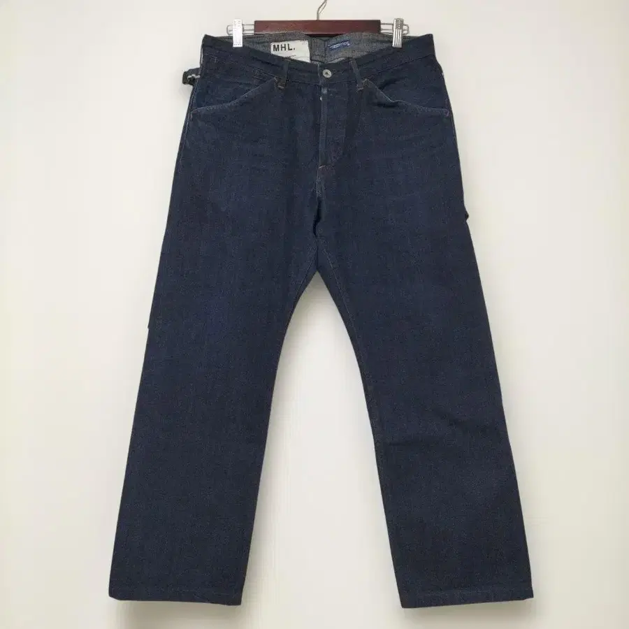 MHL. 데님 페인터 팬츠입니다. 사이드 트리플 스티치가 없는 등 페인터 팬츠 같지 않은 부분도 있으며, 접으면 셀비지가 보입니다. 그다지 와이드하지 않은 스트레이트 실루엣입니다.