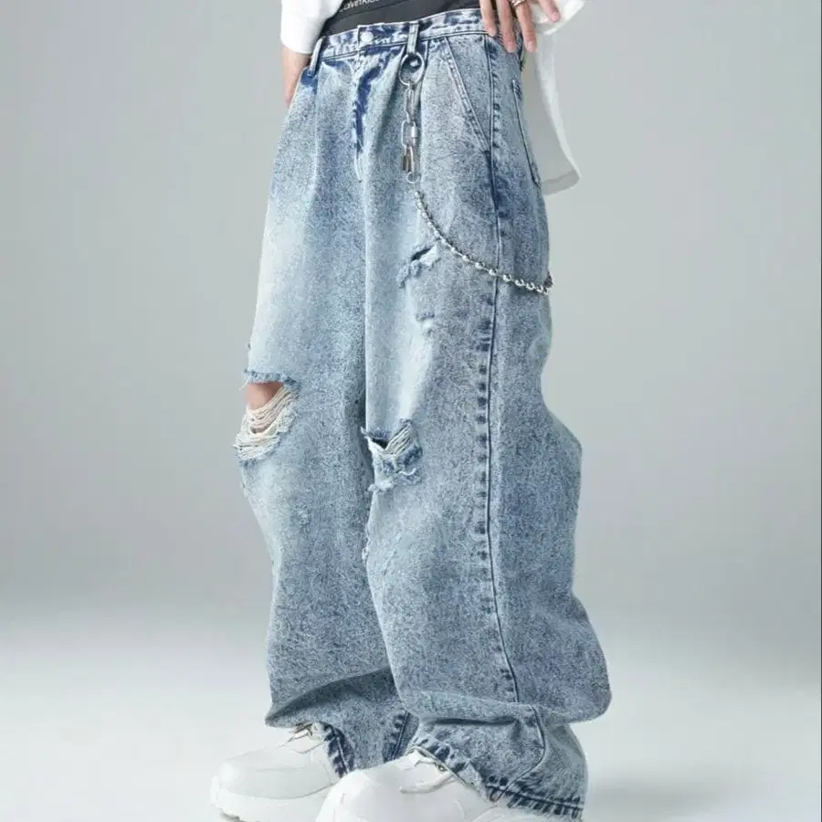 가벼운 색감의 배기 데님, 데미지 가공과 체인 디테일이 특징. - Color: Light Blue - Color: Dark Blue - Style: Baggy - Features: Distressed, Ripped - Accessories: Chain Detail 허리: 81 밑위: 39 인심: 71 밑단 폭: 27 정가: 6600 몇 번 착용하지 않았습니다. 방문해 주셔서 감사합니다.
