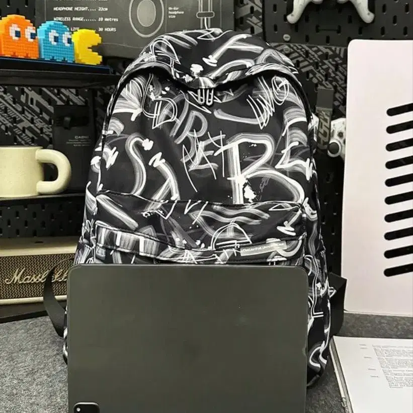 그래피티 디자인의 내구성 백팩, 태블릿 수납 가능. - 디자인: 그래피티풍의 블랙과 화이트 패턴 - 포켓: 프론트 포켓 부착 - 사이즈: 태블릿 수납 가능 방문해 주셔서 감사합니다.