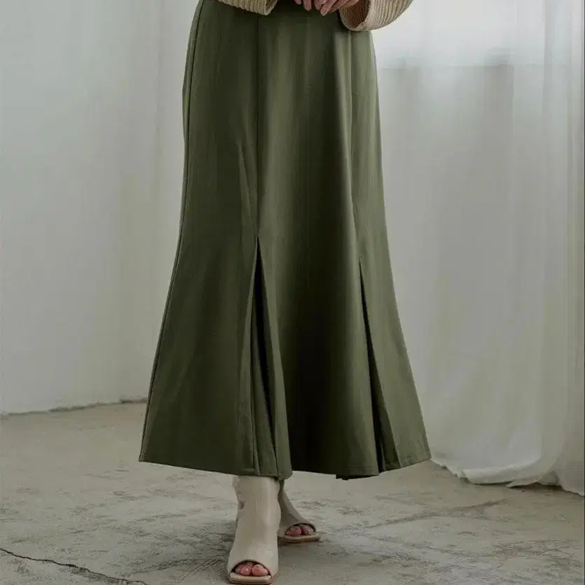 사진보다 선명한 그린 (카키색이라고 할 수 있는 범위)의 머메이드 스커트입니다. 플리츠가 들어가 있어서 퍼지는 모양이 매우 예쁩니다.