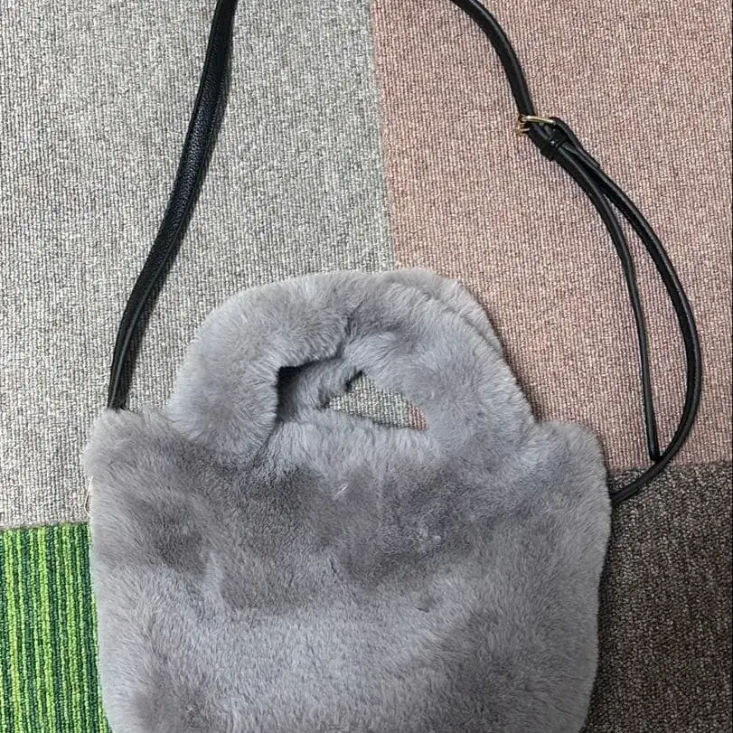 부드러운 퍼 소재의 그레이 색상 숄더백, 핸들이 있으며 조정 가능한 스트랩입니다.