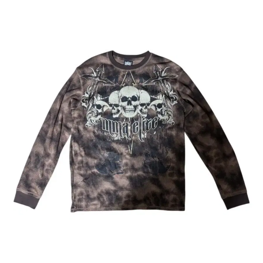 스컬과 크로스 그래픽이 특징인 MMA Elite의 긴팔 셔츠. - 브랜드: MMA Elite - 디자인: 스컬과 크로스 그래픽 - 색상: 브라운 계열 - 소재: 리브 - 스타일: 롱 슬리브 방문해 주셔서 감사합니다.
