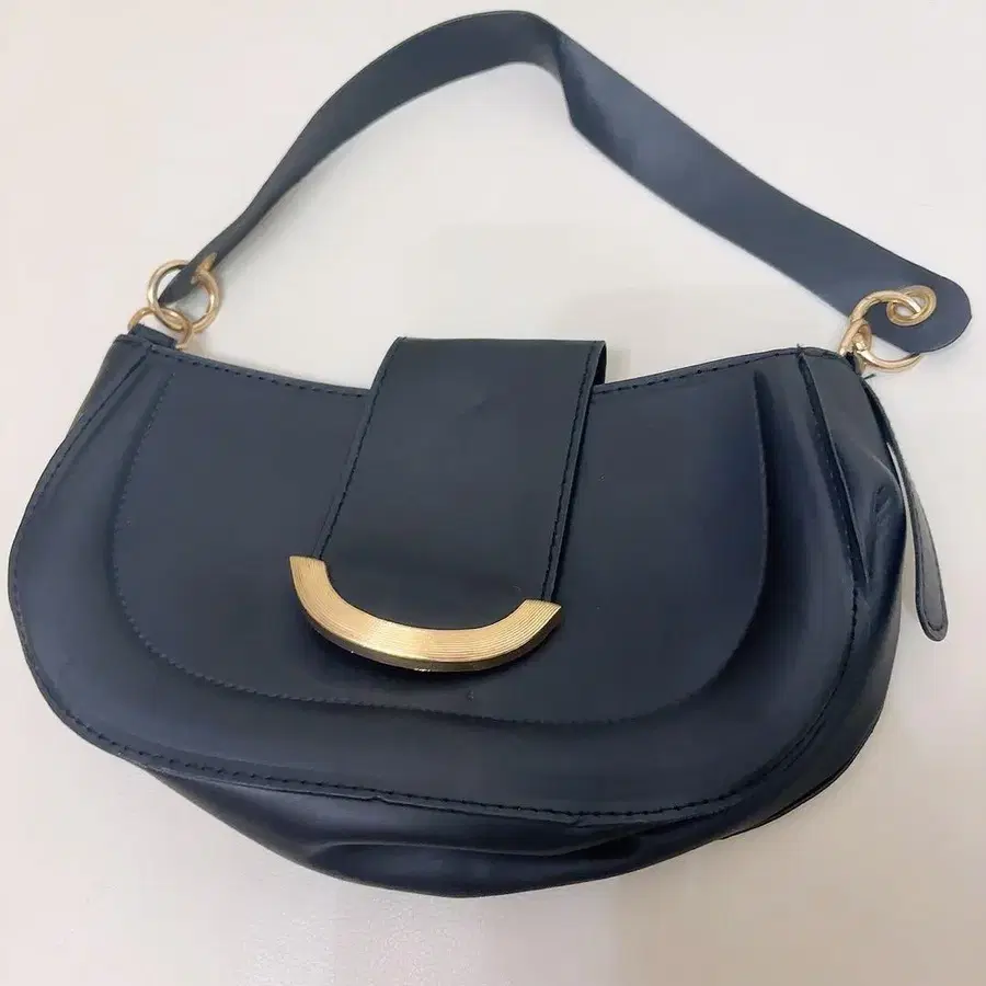 네이비 컬러의 핸드백, 골드 금장 장식이 특징입니다.