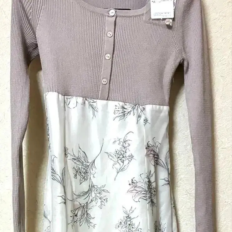베이지 색상의 긴팔 니트 원피스입니다. 꽃무늬 스커트와 레이스업 디자인이 특징입니다. 브랜드 택 없음. 겨드랑이 부분의 지퍼 위쪽에 올풀림이 있어 수선했습니다. - 색상: 베이지 - 디자인: 꽃무늬 스커트 부분 - 소매 길이: 긴팔 - 백 스타일: 레이스업 디자인 - 버튼: 앞면에 버튼 있음 방문해 주셔서 감사합니다. 사이즈 - M