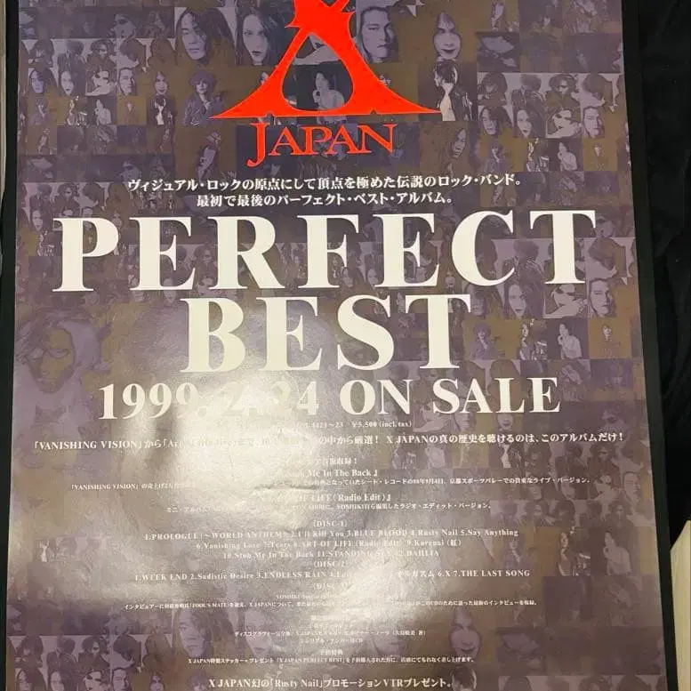 자동 번역되었어요. 원문보기X JAPAN의 명곡을 모은 1999년 출시된 PERFECT BEST 포스터.