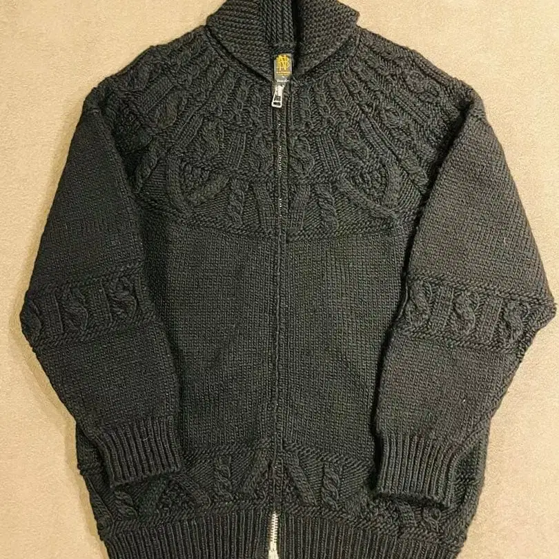 자동 번역되었어요. 원문보기집업 디자인의 블랙 니트 스웨터, 사이즈 4, 아란 편직 디테일이 특징.