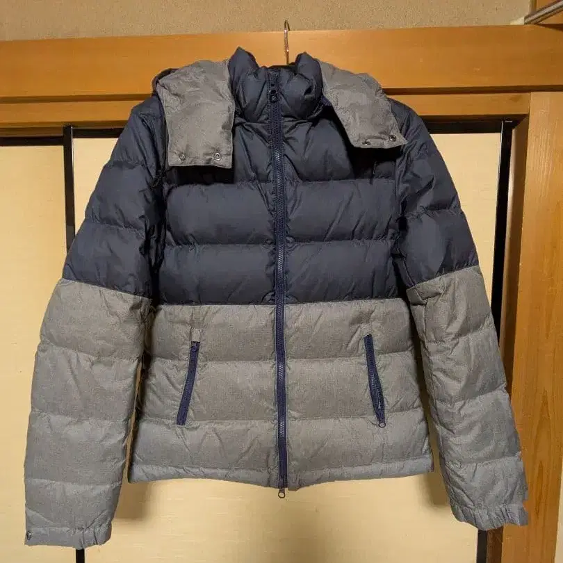 디자인은 심플하면서도 네이비와 그레이의 배색이 특징인 다운 자켓이며, 후드도 간단하게 지퍼로 탈부착 가능합니다.