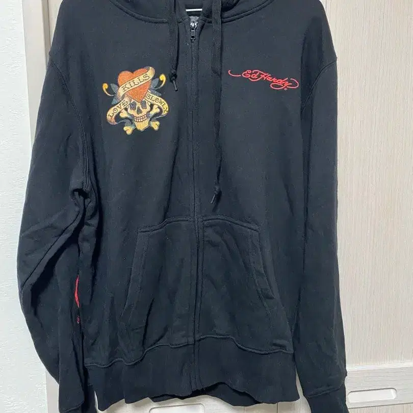 ED HARDY의 스컬과 하트 그래픽이 특징인 블랙 집업 후드티.