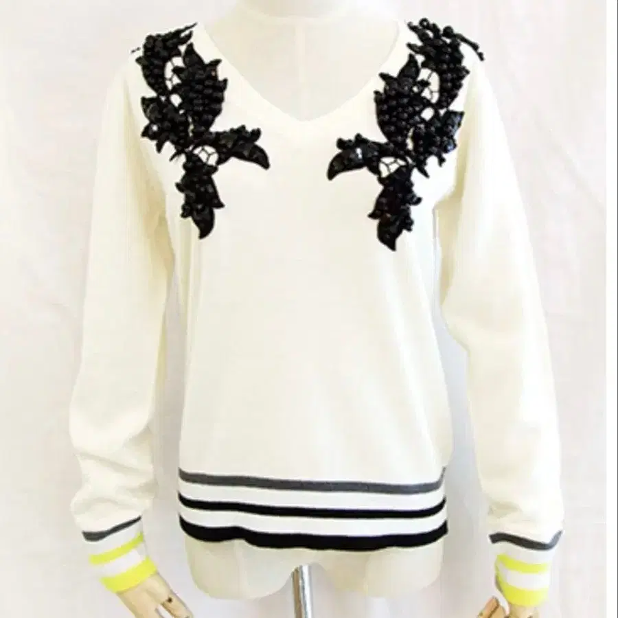 적당히 파인 V넥이 여성스러우며, 소매와 밑단의 배색 라인이 세련된 인상을 줍니다.