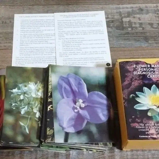 꽃 사진이 인쇄된 퍼스널리티 진단 카드. - 상품명: Flower Mandala Personality Diagnosis Healing Cards - 카드 종류: 인쇄물 - 내용물: 카드와 설명서 - 디자인: 꽃 사진이 인쇄된 카드 - 용도: 퍼스널리티 진단 및 힐링 방문해 주셔서 감사합니다. 기타 자세한 내용은 추후 안내