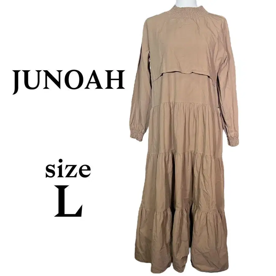 베이지 색상의 티어드 디자인 긴팔 원피스, 사이즈 L.