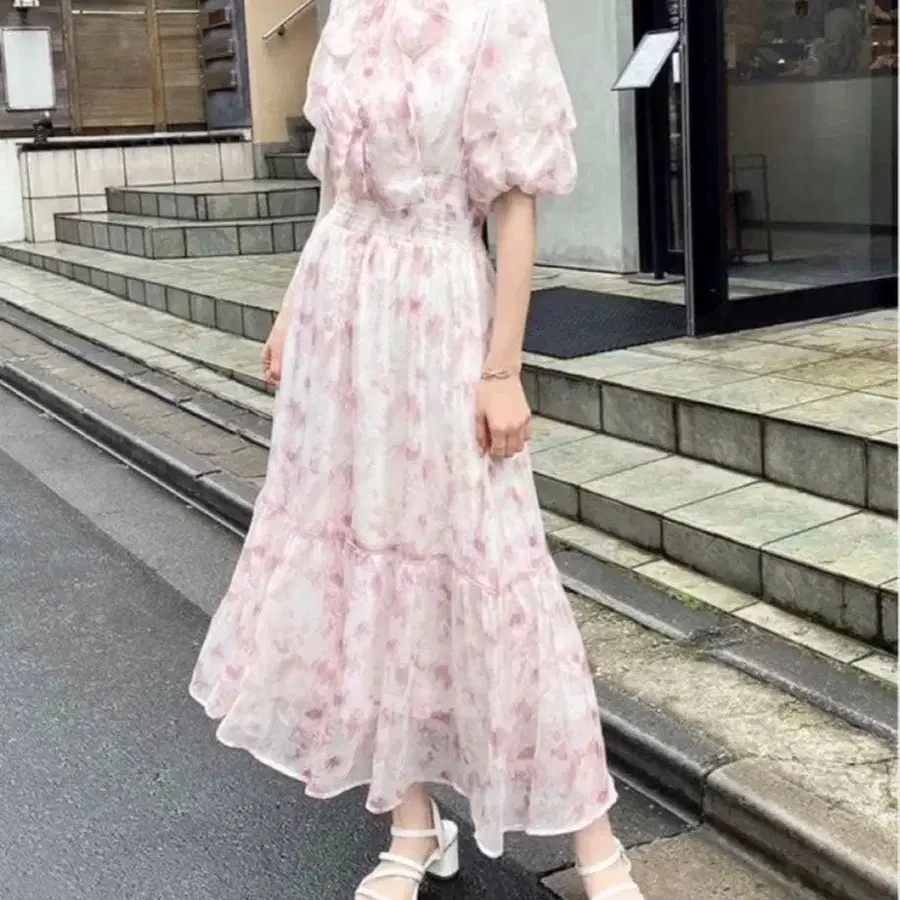 NICE CLAUP 수채화 패턴 보우다이 원피스 핑크