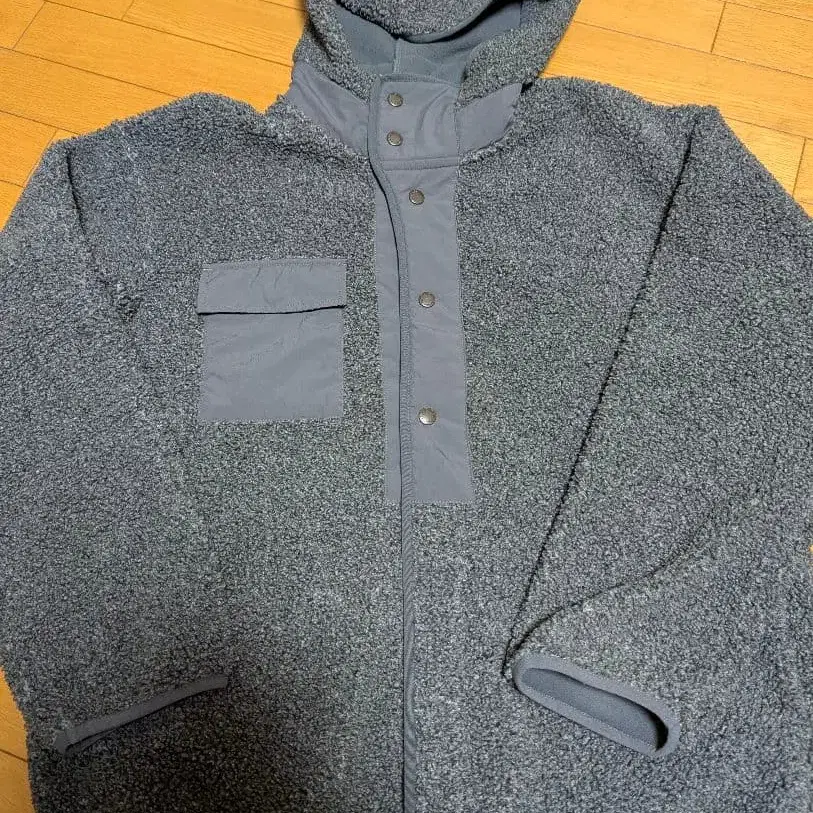 후드 부착된 그레이 색상의 플리스 자켓으로, 단추식과 포켓이 있어 기능적입니다.