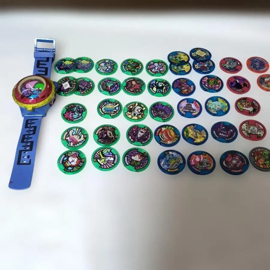 요괴워치와 요괴 메달 41개(중복 4개) 세트 작동 확인 완료되었습니다. - 아이템명: 요괴워치 완구 세트 - 부속품: 코인 41개 - 색상: 파랑, 빨간색, 그린 - 디자인: 시계형 완구 - 코인 종류: 요괴 캐릭터 코인 방문해 주셔서 감사합니다.