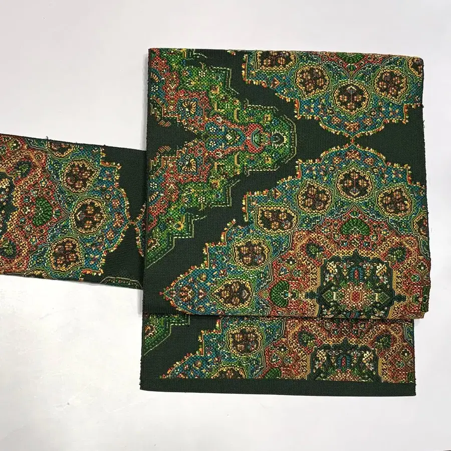 자동 번역되었어요. 원문보기짙은 녹색 바탕에 선명한 꽃 문양이 돋보이는 아름다운 디자인의 나고야 오비입니다.